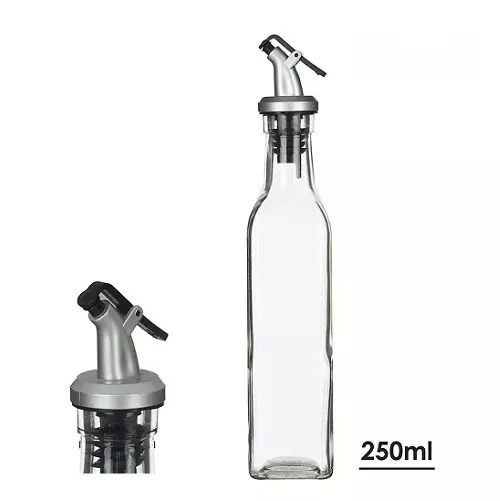 Aceitera vidrio con tapón dosificador, capacidad 250 ml. Medida 5 x 5 x 24,5 cm