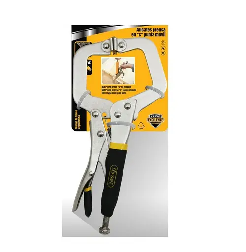 Alicates de 10» con prensa en «C» de punta móvil. Calidad industrial. Mordaza de gran amplitud. Punta giratoria para sujetar piezas cónicas e irregulares. Queda fija en la posición deseada. Con tornillo regulador y palanca de liberación.