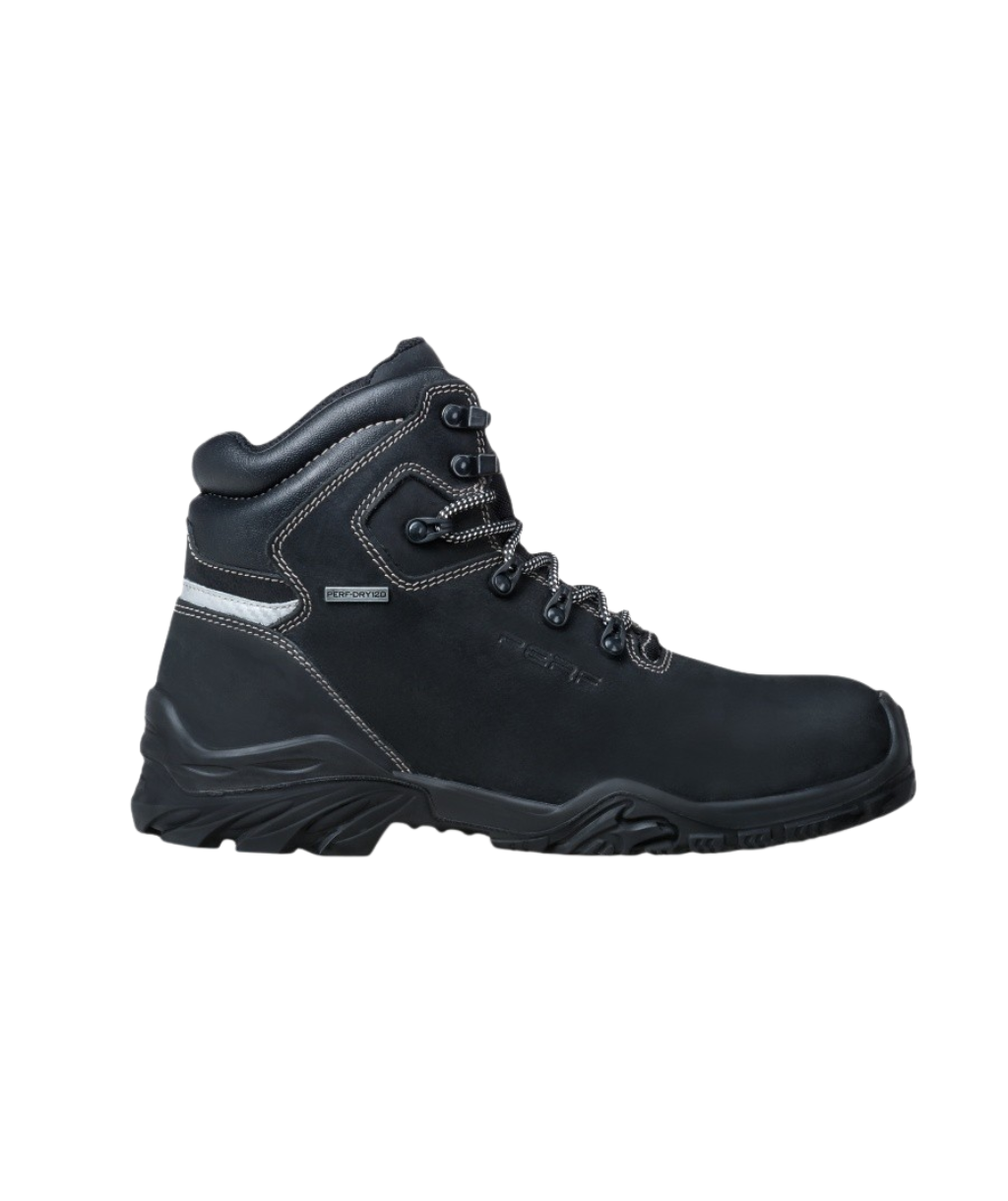 Bota de seguridad S3 de piel Nobuck resistente al agua y con una resistencia óptima a la abrasión. Cuenta con una suela de poliuretano de doble densidad y una puntera no metálica Top Defence amágnetica de material compuesto y un 50% más ligero que el acero. Este calzado asegura un excelente confort durante toda la jornada de trabajo y en el diseño se incluyen detalles en alta visibilidad.