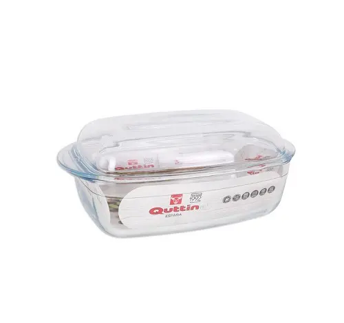Cacerola de vidrio en forma rectangular con tapa. De marca Quttin, con capacidad de 4.4l + 2.3l.