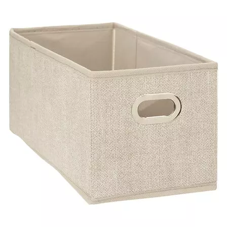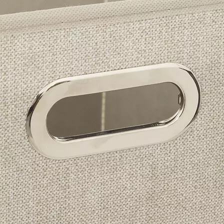 Caja de almacenamiento con asas metálicas para facilitar su transporte. Fabricada en tela por fuera y cartón por dentro para mantener su forma. Puedes usarlo como espacio de almacenamiento en un estante. Perfecto para mantener tus artículos organizados y al mismo tiempo añadir un toque moderno a tu decoración. Cartón de 2mm de espesor.