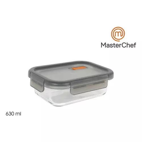 Fiambrera hermética con tapa color gris de colección MasterChef, ideal para almacenar alimentos. Medida 17.6×13.2x6cm