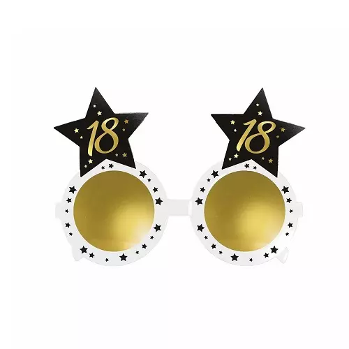 Gafas de material PVC en forma redonda con estrella «18». Color negro, dorado y blanco. Complemento divertido para celebrar la fiesta. Medida: 14 x 10 cm