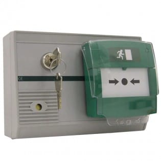 Hoyles ACP100G Alarmed Emergency Release Resettable call point. Alarmed Emergency release call point with integrated alarm provides a deterrent against the misuse of Emergency Releases, ideal for vulnerable Emergency doors.