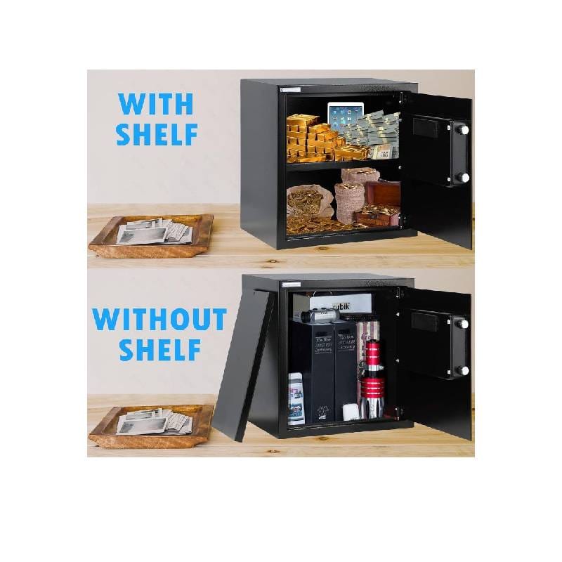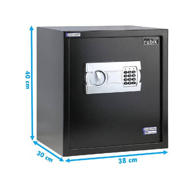 Rubik security safe box is protected with a digital keypad lock, can be easily re-programmed at any time (uses 4 x AA Alkaline Batteries). Comes with 2 emergency override keys. Equipped with 1 removable shelf for easier organization and floor carpet to protect against scratches and damage. Pre-drilled holes for mounting on Wall, Floor or inside Cabinet. Solid steel construction, equipped with two live-bolts door locking mechanism prevents protection from forced entry. 4mm door thickness, 2mm body thickness to protect your personal valuables.Ideal for home and office, this Rubik safe gives you large capacity to store cash, jewelry, watches, gold, papers, documents, camera, passports, and more.